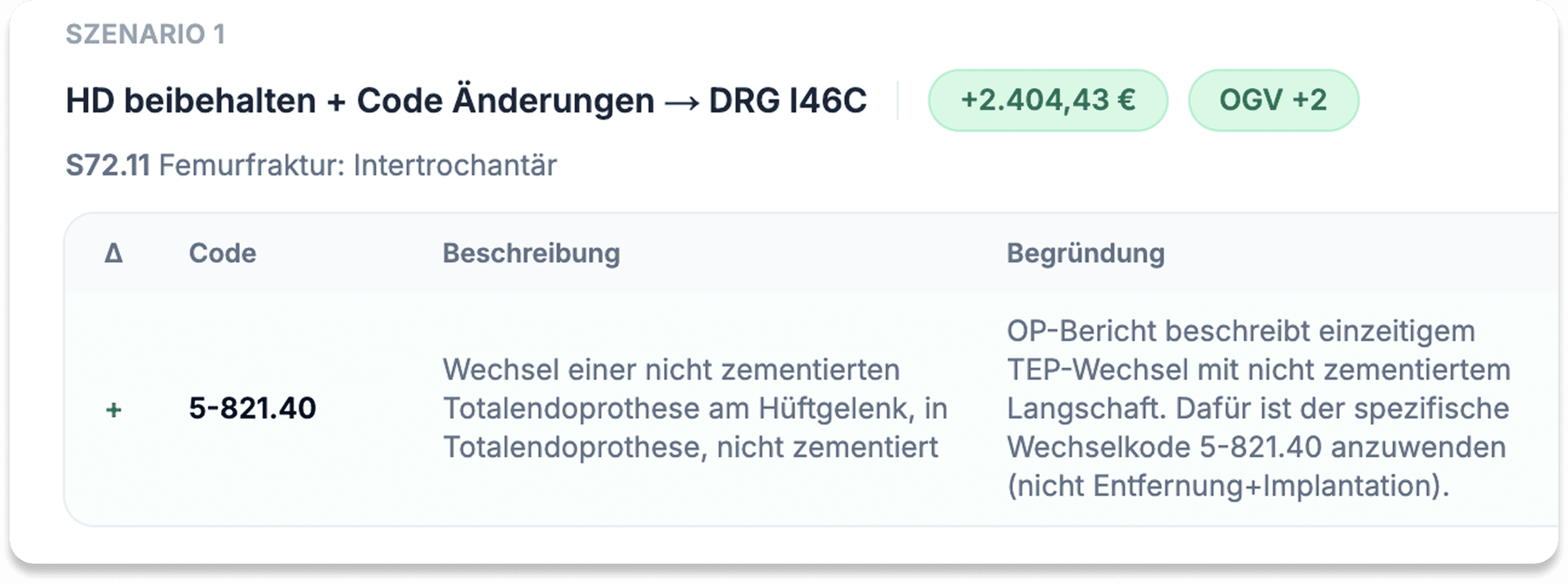 Wir lesen die gesamte Patientenakte – jede Seite, jeden Befund, selbst schlecht gescannte Dokumente – und analysieren laufend alle erlösrelevanten Aspekte. Mit der Gründlichkeit eines erfahrenen Medizincontrollers, der unbegrenzt Zeit hat.